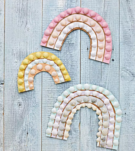 برای این که یک رنگینکمان صدفی زیبا داشته باشید، مقوایی از ظروف یا جعبههای باقیمانده در خانه تهیه کنید. مقوا را به صورت قوسی و با دقت زیاد برش دهید تا شکل رنگینکمان به خود بگیرد. حالا باید مقواها را به رنگ دلخواه خود دربیاورید. بعد از آن نوبت به چسباندن صدفها بر روی مقوا میرسد. در نهایت هم باید رنگینکمان صدفی خود را روی دیوار محل دلخواه خود بچسبانید.