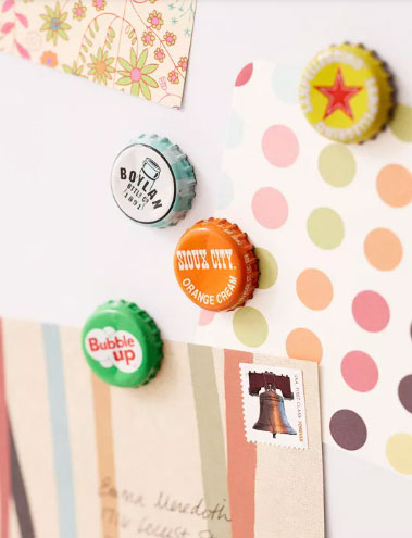 وقتی نوشیدنیهایی، مثل نوشابه را مصرف میکنید، درب آن را دور نریزید! یکی از بهترین شیوهها برای استفاده از وسایل بازیافتی در دکوراسیون خانه، بخصوص در آشپزخانه، همین دربهای بطریهای نوشیدنی هستند. دربهای رنگارنگ بطریهای نوشیدنیهای مختلف را جدا کرده و با استفاده از یک چسب یا آهنربای بسیار کوچک به یخچال، کابینت یا هر جای دیگری که دوست دارید بچسبانید.