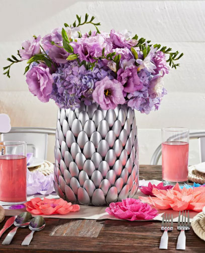 بعد از این که به شکل گرد آنها را به هم چسباندید، اسپری رنگ متالیک به آن بزنید تا ظاهر جذابی به خود بگیرد. حالا قاشقها را میتوانید دور یک گلدان سفالی یا پلاستیکی بچسبانید. حالا یک گلدان فلزی زیبا به شکل پولکهای ماهی در اختیار خواهید داشت.