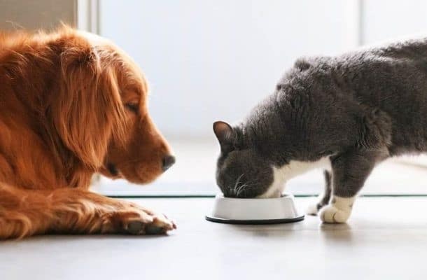 سگ و گربه در حال غذا خوردن در ظرف مخصوص