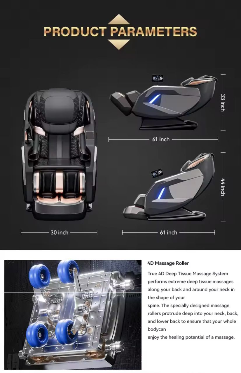 • ماساژ 3D و غلطک‌های هوشمند: این صندلی مجهز به غلطک‌های پیشرفته برای ماساژ کامل از گردن تا پا است که همراه با ریل L شکل، نقاط حساس بدن را با دقت پوشش می‌دهد.