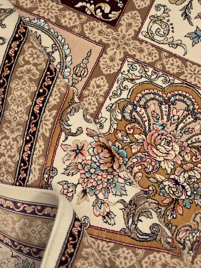 فرش ماشینی مدرن سیزان کاشان شامل : تراکم عرضی فرش (شانه) : 1200 شانه – تراکم طولی فرش : 2400 – تراکم گره : 350000 – گره نوع بافت : گل برجسته – ارتفاع نخ خاب : 1 ± 6 – جنس نخ خاب : میکروفیلامنت – جنس نخ تار : پلی استر و پنبه – جنس نخ پود : پنبه و جوت است.