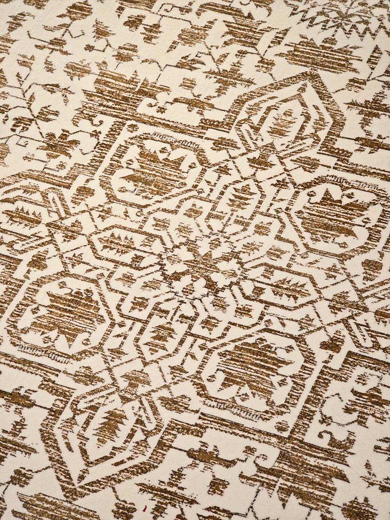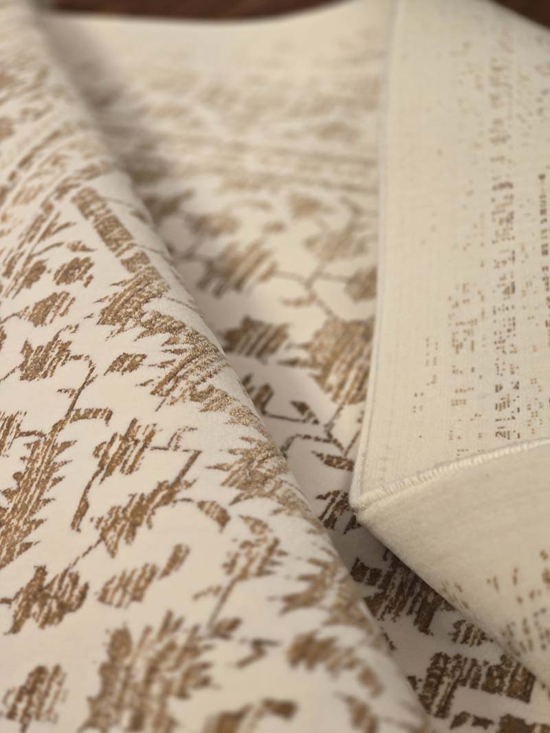 فرش ماشینی مدرن سیزان کاشان شامل : تراکم عرضی فرش (شانه) : 1200 شانه – تراکم طولی فرش : 2400 – تراکم گره : 350000 – گره نوع بافت : گل برجسته – ارتفاع نخ خاب : 1 ± 6 – جنس نخ خاب : میکروفیلامنت – جنس نخ تار : پلی استر و پنبه – جنس نخ پود : پنبه و جوت است.