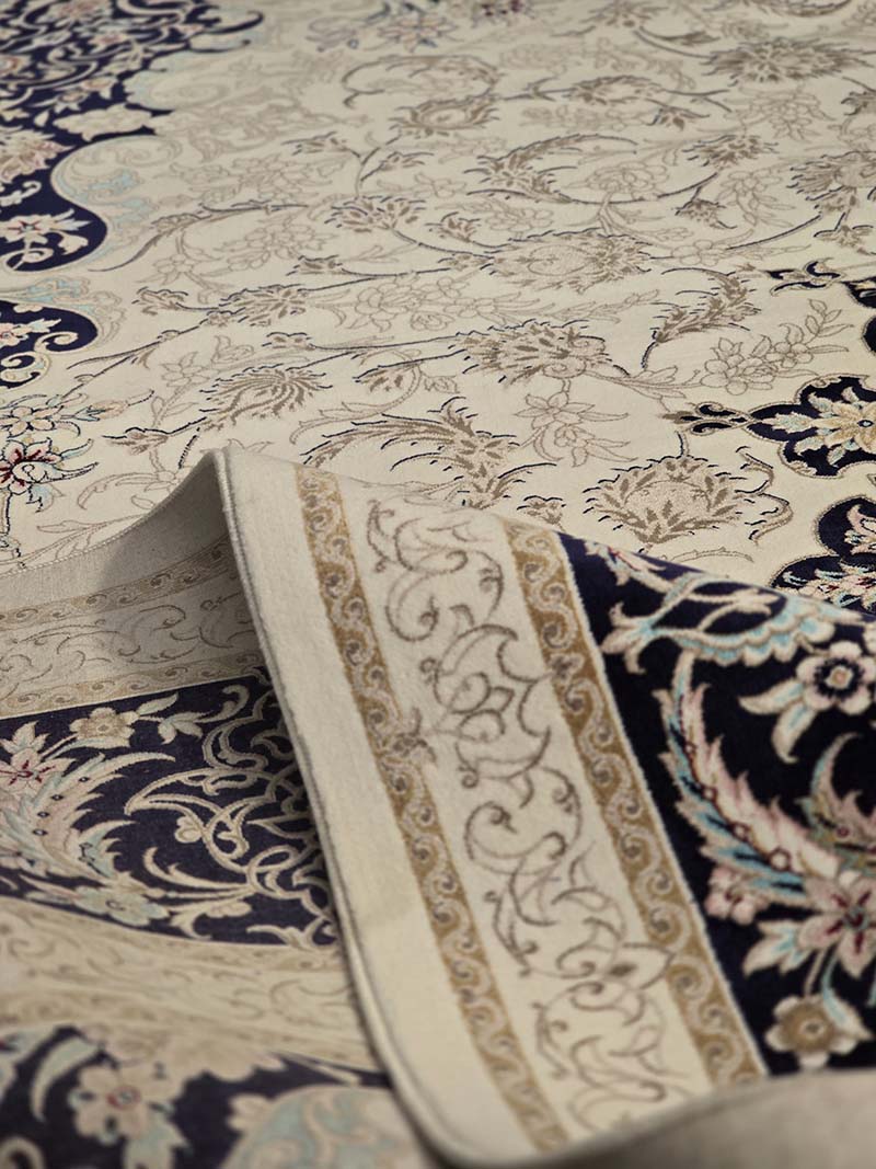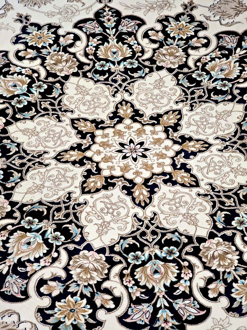 فرش ماشینی مدرن سیزان کاشان شامل : تراکم عرضی فرش (شانه) : 1200 شانه – تراکم طولی فرش : 2400 – تراکم گره : 350000 – گره نوع بافت : گل برجسته – ارتفاع نخ خاب : 1 ± 6 – جنس نخ خاب : میکروفیلامنت – جنس نخ تار : پلی استر و پنبه – جنس نخ پود : پنبه و جوت است.