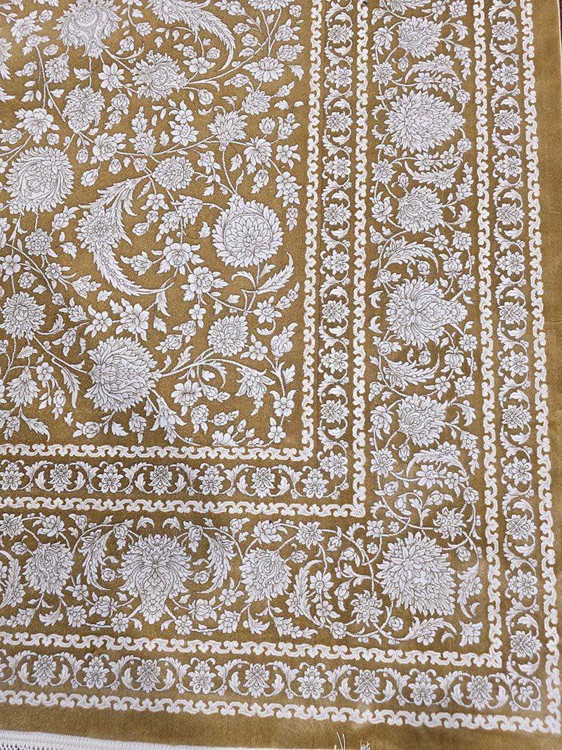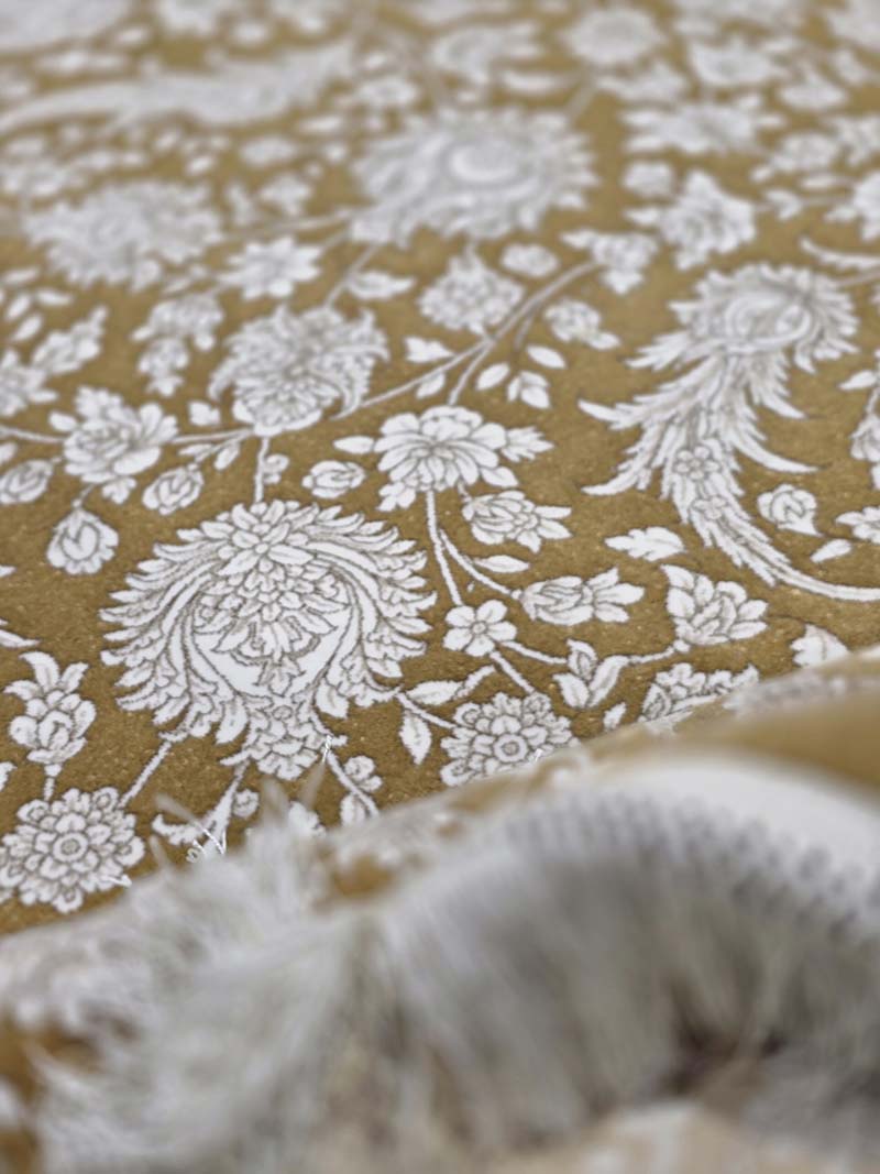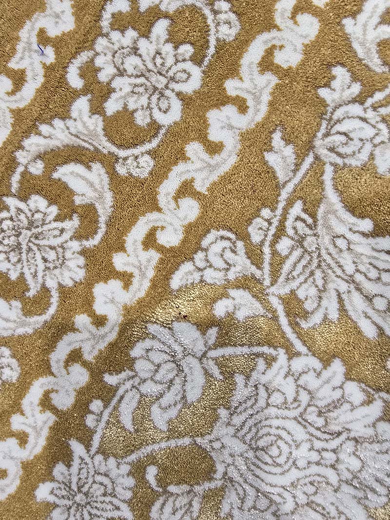 فرش ماشینی مدرن سیزان کاشان شامل : تراکم عرضی فرش (شانه) : 1200 شانه – تراکم طولی فرش : 2400 – تراکم گره : 350000 – گره نوع بافت : گل برجسته – ارتفاع نخ خاب : 1 ± 6 – جنس نخ خاب : میکروفیلامنت – جنس نخ تار : پلی استر و پنبه – جنس نخ پود : پنبه و جوت است.