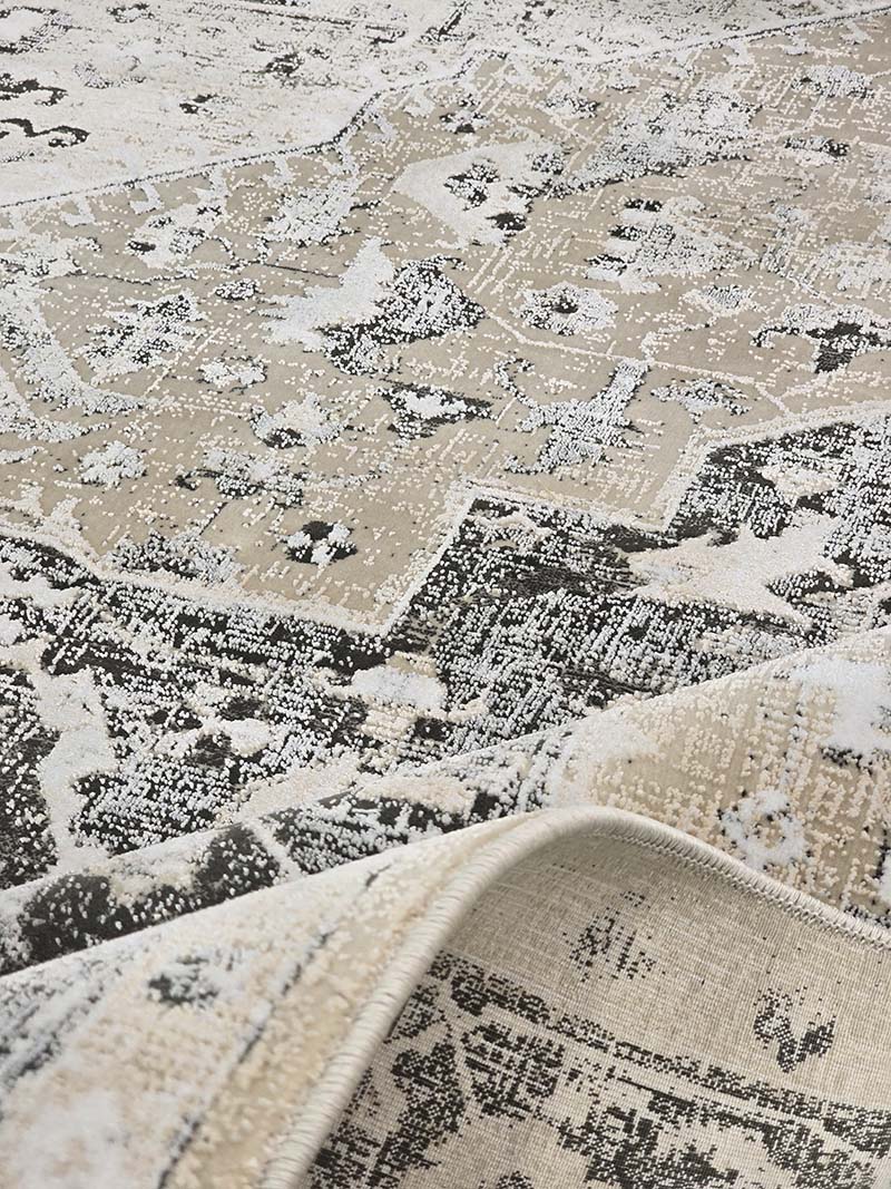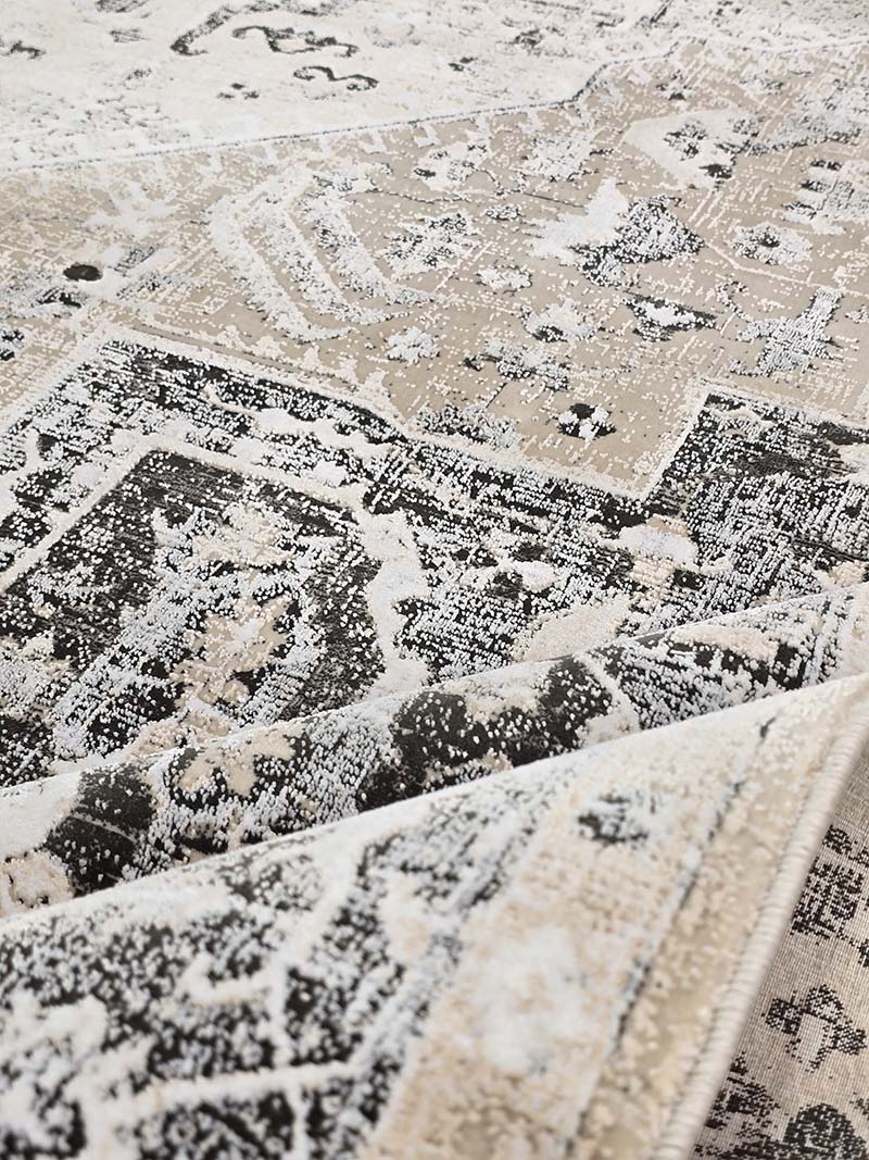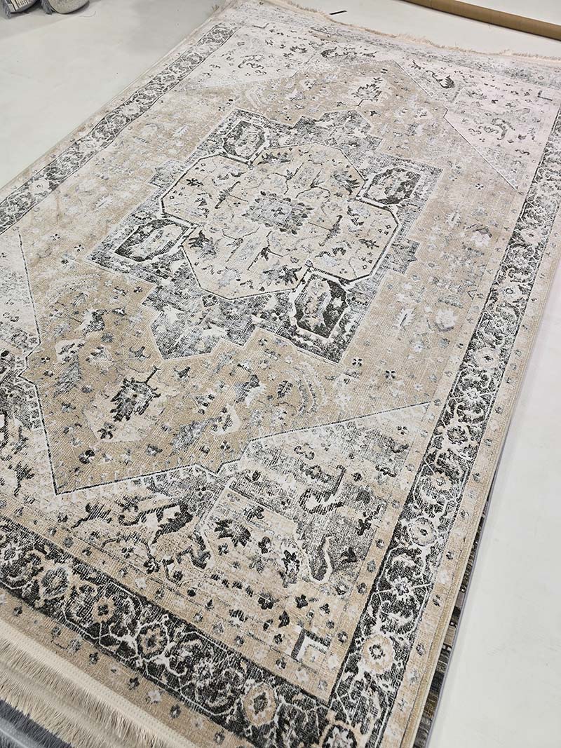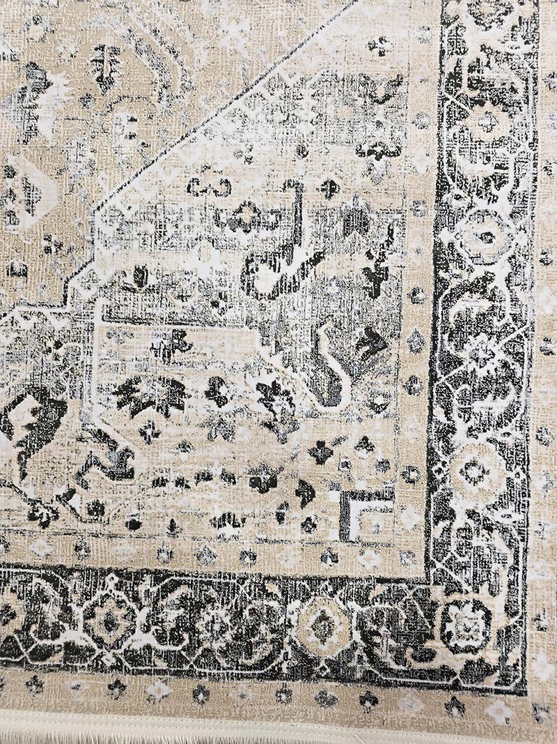 فرش ماشینی مدرن سیزان کاشان شامل : تراکم عرضی فرش (شانه) : 1200 شانه – تراکم طولی فرش : 2400 – تراکم گره : 350000 – گره نوع بافت : گل برجسته – ارتفاع نخ خاب : 1 ± 6 – جنس نخ خاب : میکروفیلامنت – جنس نخ تار : پلی استر و پنبه – جنس نخ پود : پنبه و جوت است.
