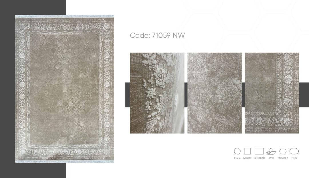 فرش ماشینی کد 71059nw شامل : تراکم عرضی فرش (شانه) : 700 شانه – تراکم طولی فرش : 2100 – تراکم گره : 350000 – گره نوع بافت : گل برجسته – ارتفاع نخ خاب : 1 ± 6 – جنس نخ خاب : میکروفیلامنت – جنس نخ تار : پلی استر و پنبه – جنس نخ پود : پنبه و جوت است.