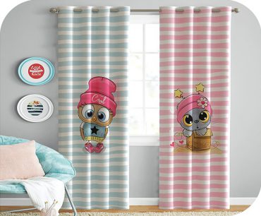 پرده چاپی کد 775776 طرح عروسک با رنگ صورتی و آبی و دو قواره متفاوت است که با طرح کارتونی و کودکانه مناسب اتاق کودکان و نوزادان است .