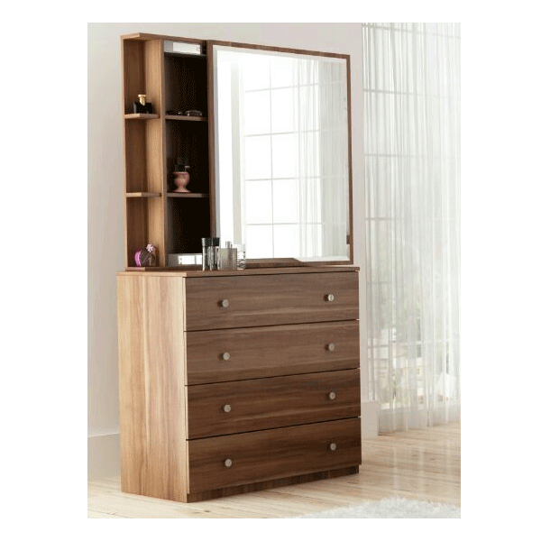 میز آرایش مدل آیلین از ترکیب چوب و ام دی اف های روکشدار خارجی تولید می شود . این محصول دارای پایه های کوچک و ریل های فلزی روان می باشد . این محصول با رنگ ها و طرح های طبیعی بسیار زیبا می شود . ورق های ام دی افی که از روکش های طرح چوب استفاده کرده اند بسیار زیبا هستند . این نوع ورق ها و رنگ ها به فضای منزل شما حسی سراسر از آرامش می دهند .