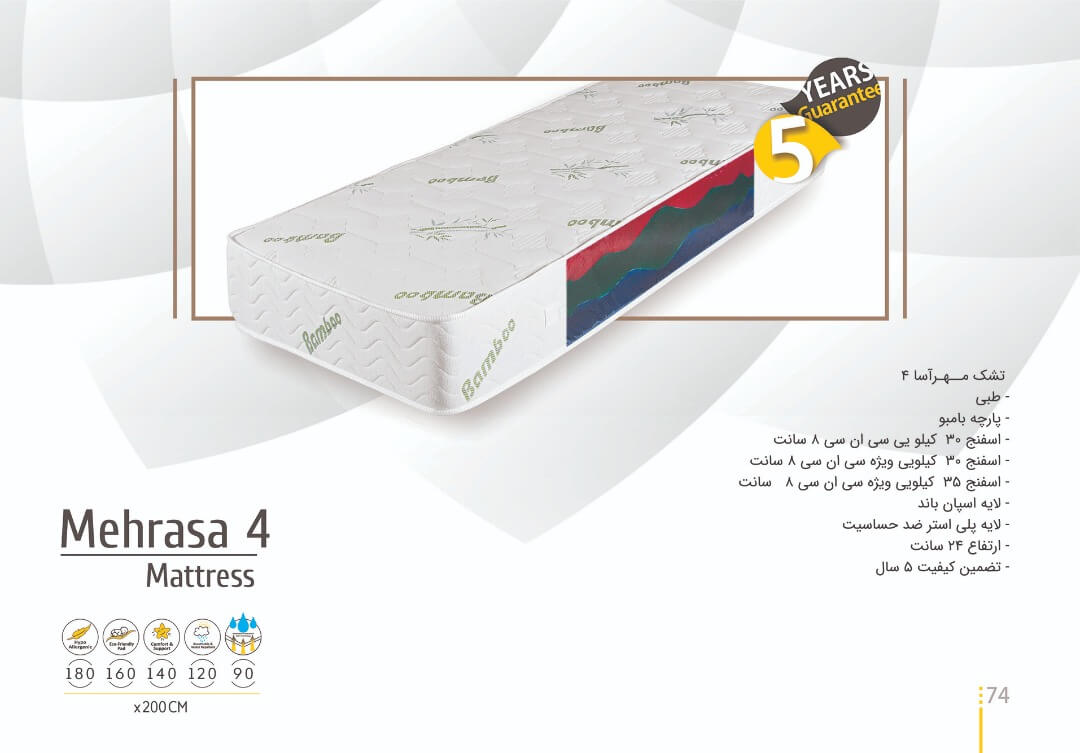 مشخصات فنی : مهرآسا4 دارای 24 سانتیمتر ارتفاع است. شامل اسفنج های سی ان سی و بدون فنر است. تشک مهرآسا4 از نوع تشکهای طبی است که بهترین کیفیت خواب را فراهم میکند. اسفنج های سی ان سی مقاومت زیادی دارند. حذف فنر باعث کنترل حالت ارتجاعی فنر، سفت بودن و طبی شدن تشک میشود. استفاده از 8 سانتیمتر اسفنج 30 کیلوئی سی ان سی، 8 سانتیمتر اسفنج 30 کیلوئی سی ان سی ویژه و 8سانتیمتر اسفنج 30 کیلوئی سی ان سی ویژه دلیل طبی بودن تشک است، تشک پرن از شرکت رویال آریانا مدل مشابهی برای تشک مهرآسا4 است. تشک طبی پرن دارای تحمل وزن بالای 90 کیلوگرم است.