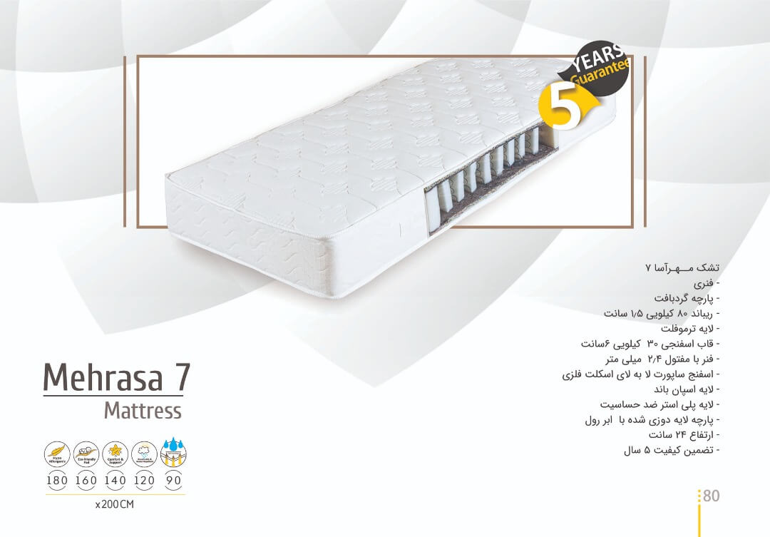 مشخصات فنی : تشک مهرآسا7 دارای 25 سانتیمتر ارتفاع است. شامل فنر متصل یکپارچه است. تشک مهرآسا7 از نوع تشکهای طبی است که بهترین کیفیت خواب را فراهم میکند. فنربندی متصل به صورت یک لایه یکپارچه فنر در هسته مرکزی تشک است. تشکهای فنر متصل را به نام تشکهای خوشخواب میشناسیم و درجه سفتی متفاوت از کاملا نرم تا کاملا سفت را دارند. تشک مهرآسا7 دارای درجه سفتی متوسط رو به نرم است. ترکیب اسفنج های 30 کیلویی در کنار اسفنج ریباند باعث شده که این تشک دارای درجه سفتی متوسط رو به نرم باشد. مدل دیگری از تشکهای فنرمتصل تشک ریلکس از برند رویال آریانا است. مشخصات تشک فنری ریلکس از برند رویال آریانا.