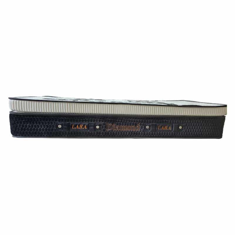 تشک لارا مدل دیاموند از ساختار سوپر طبی فنری میکرو بونل منفصل به همراه الیاف هالو 300 گرمی و با اسفنج 15 کیلوگرمی تشکیل گردیده است. قرار گرفتن این محصول در طبقه بندی محصولات الترا طبی فنری هم به استفادهی همزمان از فنر و اسفنج در ساختار تشک برمیگردد. در این نوع تشکها فنر با استفاده از تکنولوژی تزریق پلی یورتان برای استفاده بزرگسالان تقویت شده و از میزان تحمل وزن بالاتری برخوردار هستند. تشک